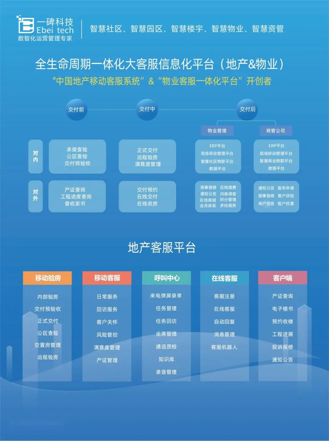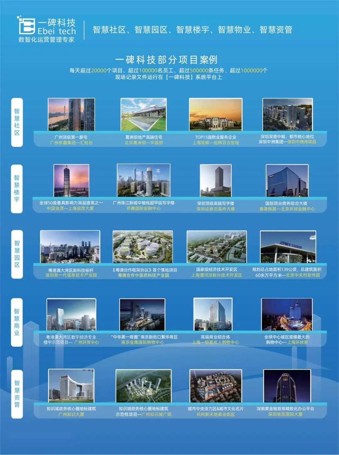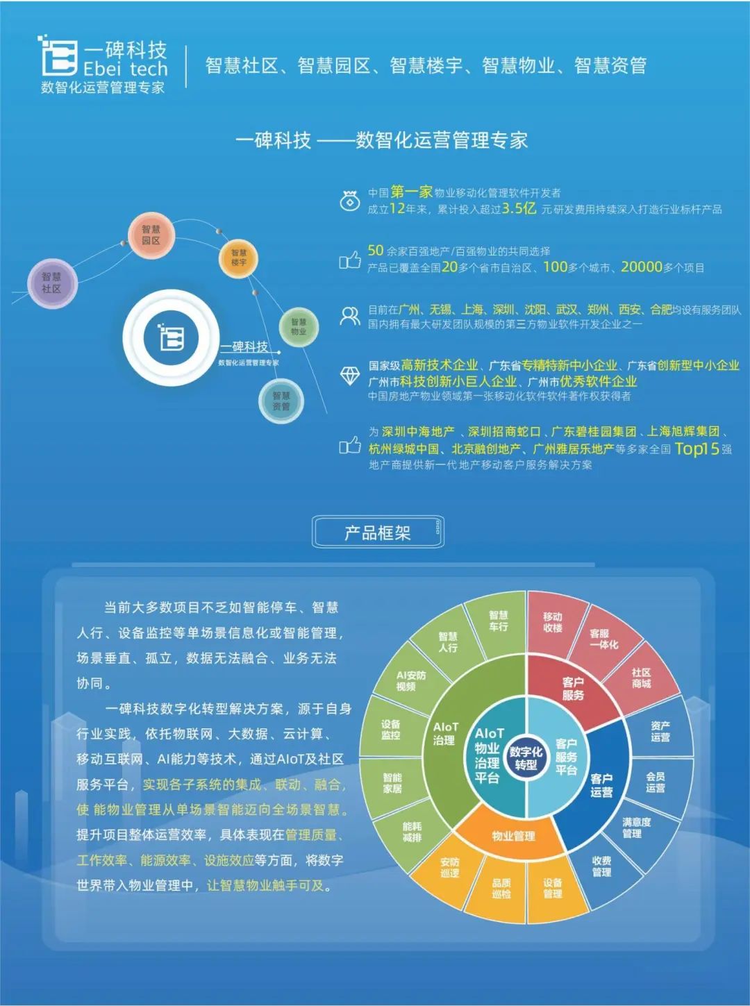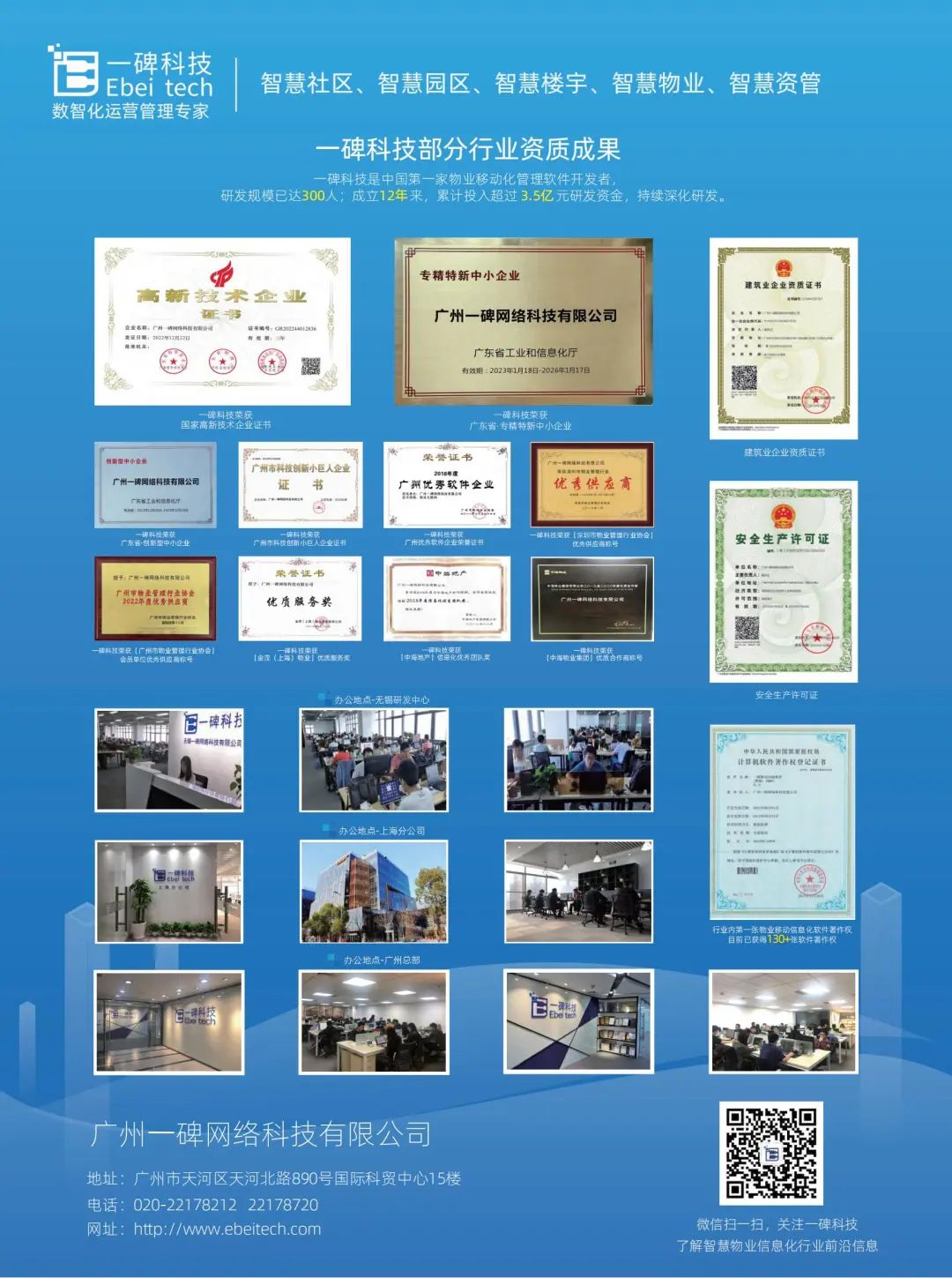 一碑科技2011年创立于广州,成立12年来,累计投入超过3.5亿元研发费用。公司目前在广州、无锡、上海、深圳、沈阳、武汉、西安、郑州、合肥等地均设有服务机构或服务团队,团队达到300人,是国内拥有最大研发团队规模的第三方物业软件开发者之一、"中国地产移动客服系统"&"中国物业移动管理系统"的开创者。目前一碑科技服务全国50余家百强地产/百强物业,产品遍布全国20多个省,100多个城市,20000多个项目。为“地产&物管&资管”企业构建移动互联网、物联网背景下的新一代全面整体的数智化解决方案——智慧社区、智慧园区、智慧楼宇、智慧物业、智慧资管。2012年获得中国房地产物业领域第一张移动化软件软件著作权,截止目前已获得130+张软著权证书;2016-2023年度,连续获得为“国家级高新技术企业”称号。2023年年初获得“广东省专精特新中心企业”认定!