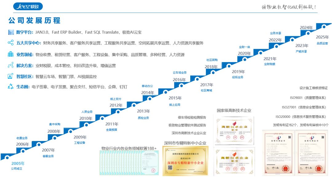 深圳市极致科技股份有限公司成立于2005年,作为深耕数据服务和拓展数据消费的服务商,始终秉承着产品领先和让用户成功的经营理念,拥有自主知识产权、快速开发及超强迭代能力的物业开发平台,产品聚焦全面收入、全面品质、全面成本,覆盖物业管理人、财、事,含收费管理、催收管理、租赁经营、空间拓展、停车改造、智能门禁、现场管理、集中采购、外包管理、人力资源、增值运营、业财税银一体化、资源战图、可视化决策等,已为全国5000多家物业企业提供了数智转型的解决方案,其中物业百强企业多达60余家,并在广州、北京、上海、武汉、成都、济南、兰州、新疆设立了全资分子公司,吸引城市代理合作伙伴50多家,成功助力了物业行业数智化步伐的加速。