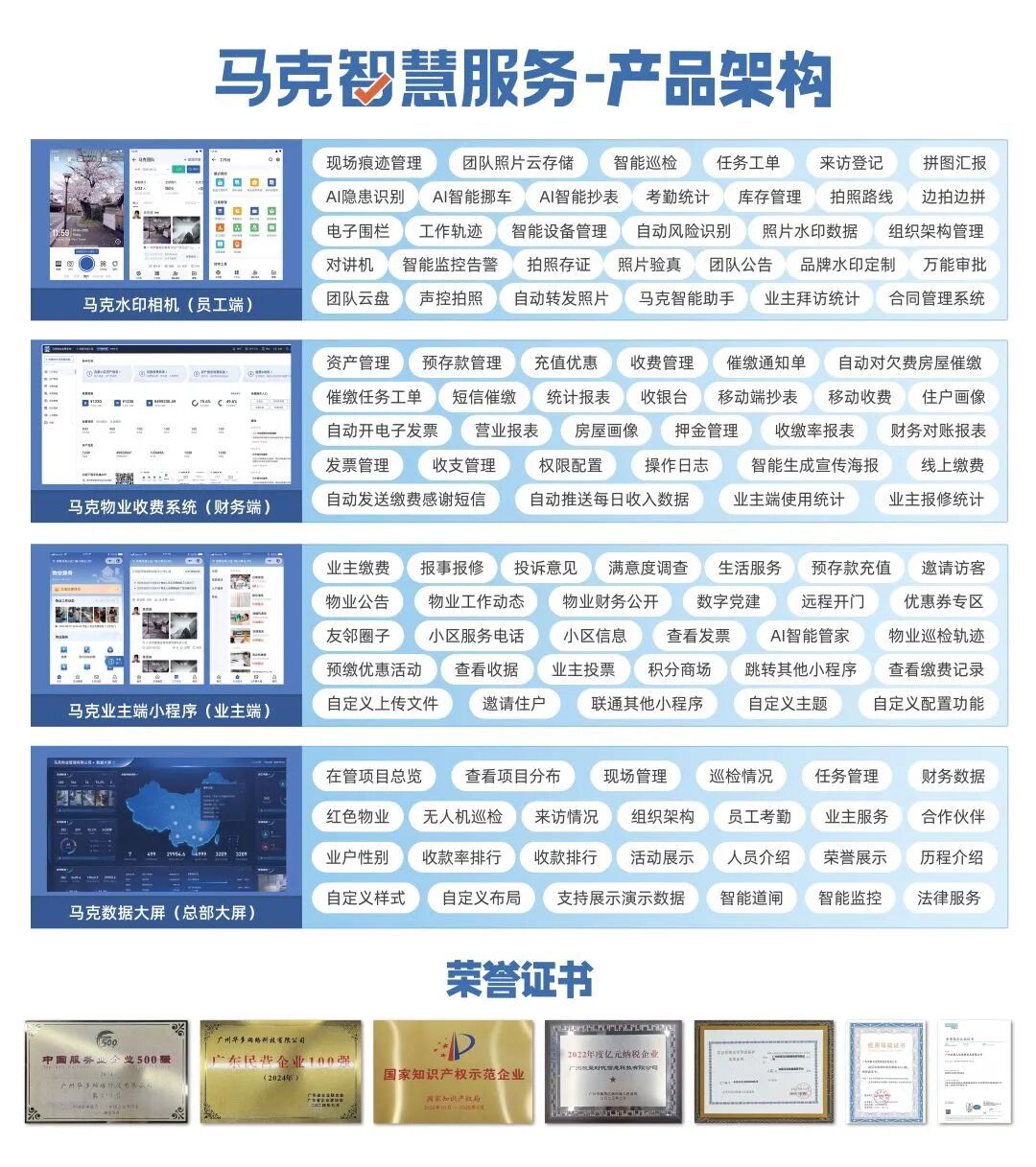 目前马克涵盖了马克水印相机(管理端)、马克收费系统(财务端)、业主小程序(业主端)等物业智慧管理功能,功能超120+,实现物业管理全覆盖。