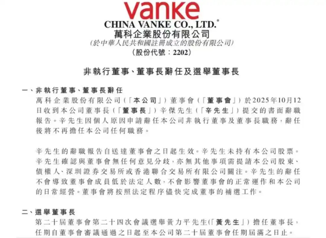 10月13日早上,万科企业在港交公告,于2025年10月12日收到本公司董事长辛杰先生提交的书面辞职报告。辛杰因个人原因申请辞任本公司非执行董事及董事长职务,辞任后将不再担任本公司任何职务。