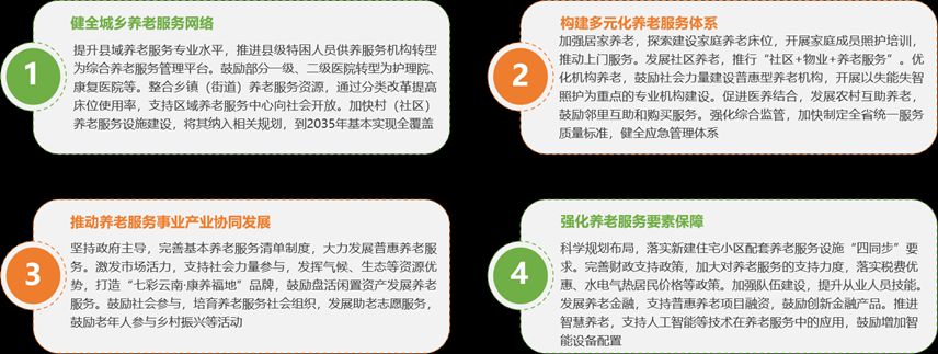 1月14日,中共云南省委、云南省人民政府发布《关于深化养老服务改革发展的实施意见》,提出四项重点任务,要求到2029年,养老服务网络基本建成,服务能力和水平显著提升,扩容提质增效取得明显进展,基本养老服务供给不断优化;到2035年,养老服务网络更加健全,服务供给与需求更加协调适配,全体老年人享有基本养老服务,适合国情及我省省情的养老服务体系成熟定型。