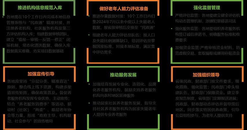 【政策解读】政策旨在加快健全养老服务网络,持续优化居家为基础、社区为依托、机构为专业支撑、医养相结合的养老服务供给格局,强化以失能老年人照护为重点的基本养老服务,健全分级分类、普惠可及、覆盖城乡、持续发展的养老服务体系,激发养老事业和产业发展活力,稳步提升养老服务质量。